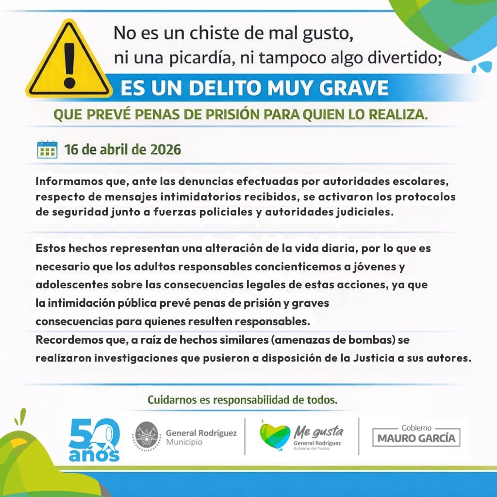 Queremos llevar tranquilidad a toda la comunidad: al momento no existe ningún indicio concreto que implique una situación de riesgo real dentro de la escuela. No obstante, se continuará trabajando activamente en el seguimiento del caso, priorizando el cuidado y bienestar de nuestros/as estudiantes.