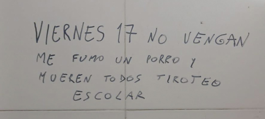 En las últimas horas, al menos cuatro escuelas de Moreno y dos de General Rodríguez denunciaron que recibieron amenazas de tiroteos dentro del establecimiento. Aparecieron pintadas (como se ilustra en este artículo) en los baños de las instituciones educativas.
